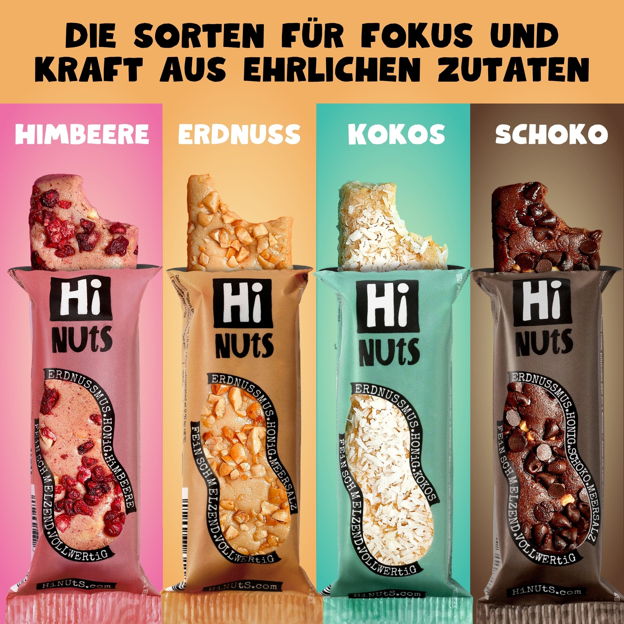 Genieße den herrlich-süßlichen Geschmack von HiNUtS, der mit jedem Bissen fein schmilzt. Erlebe die perfekte Kombination aus crunchy Erdnussmus, Honig und Meersalz, ergänzt durch Himbeeren, Kakao oder Kokos. Ein unverfälschtes Geschmackserlebnis!