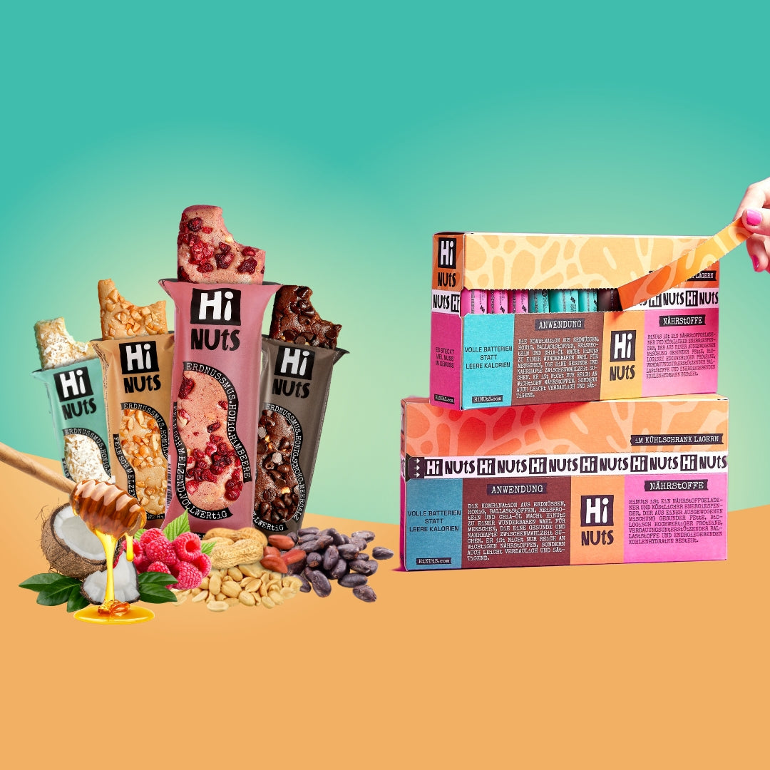 HiNUtS besteht zu 75% aus gesunden Fetten, hochwertigen Proteinen und Ballaststoffen. Die einzige Zuckerquelle ist Bio-Honig. So versorgst du deinen Körper mit wertvollen Nährstoffen statt mit leeren Kalorien.