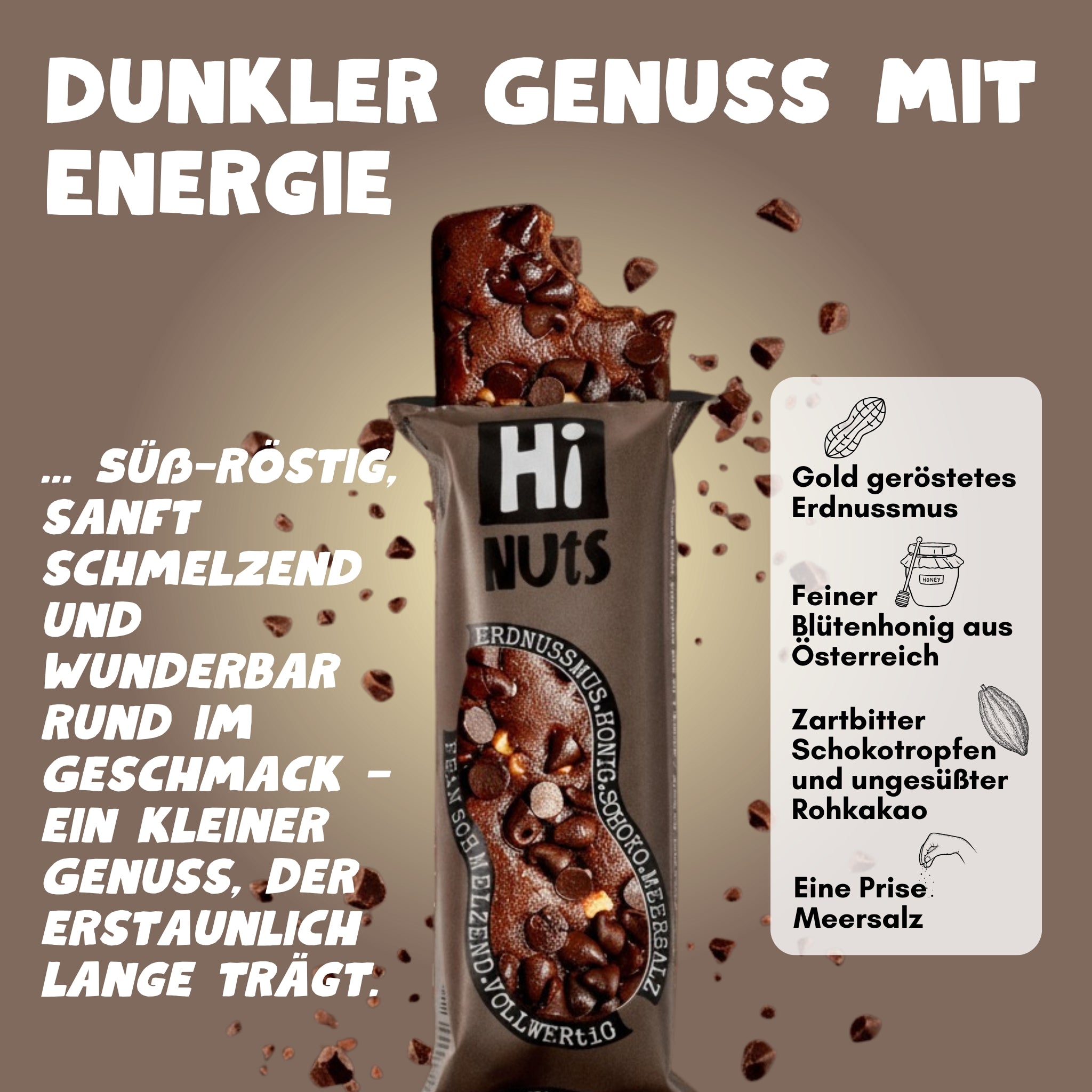 Dunkle Schokotropfen verbinden sich mit gold geröstetem Erdnussmus, honigsüßer Energie und einer Prise Meersalz – für ein Geschmackserlebnis, das süß beginnt und röstig-warm endet.